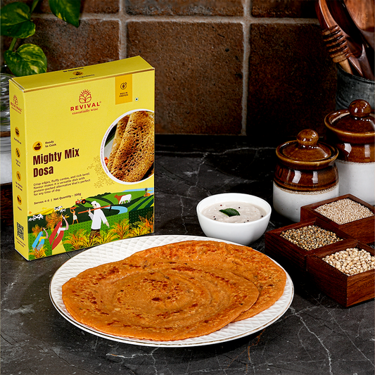 Revival Foods' Mighty Mix Dosa brings the authentic taste of South India to your plate with a unique blend of lentils and grains. This ready-to-cook mix combines the crispy edges and fluffy centre of traditional dosa with the wholesome,