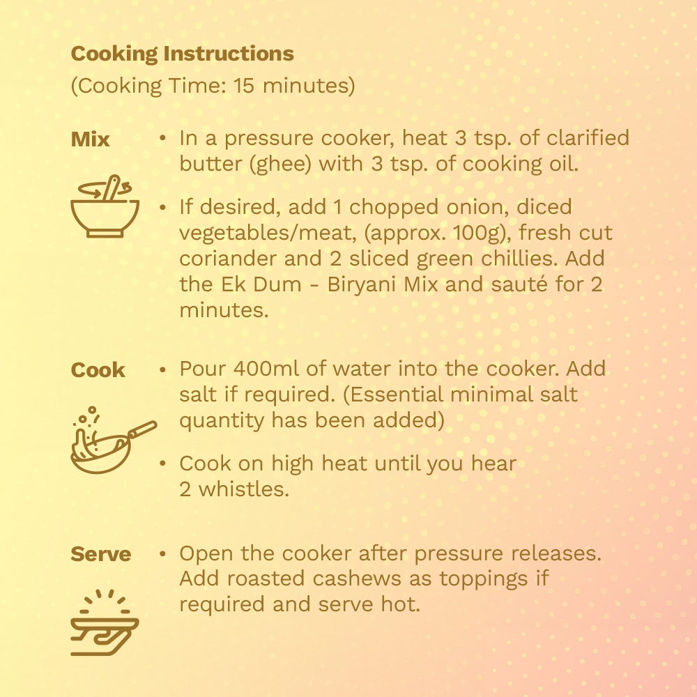 In a pressure cooker, heat 3 tsp. of clarified butter (ghee) with 3 tsp. of cooking oil. If desired, add 1 chopped onion, diced vegetables/meat, (approx. 100g), fresh cut. Pour 400ml of water into the cooker. Add salt if required. (Essential minimal salt. Cook on high heat until you hear 2 whistles. quantity has been added) coriander and 2 sliced green chillies. Add the Ek Dum - Biryani Mix and sauté for 2 minutes. Open the cooker after pressure releases. Add roasted cashews as toppings if required and serve hot.