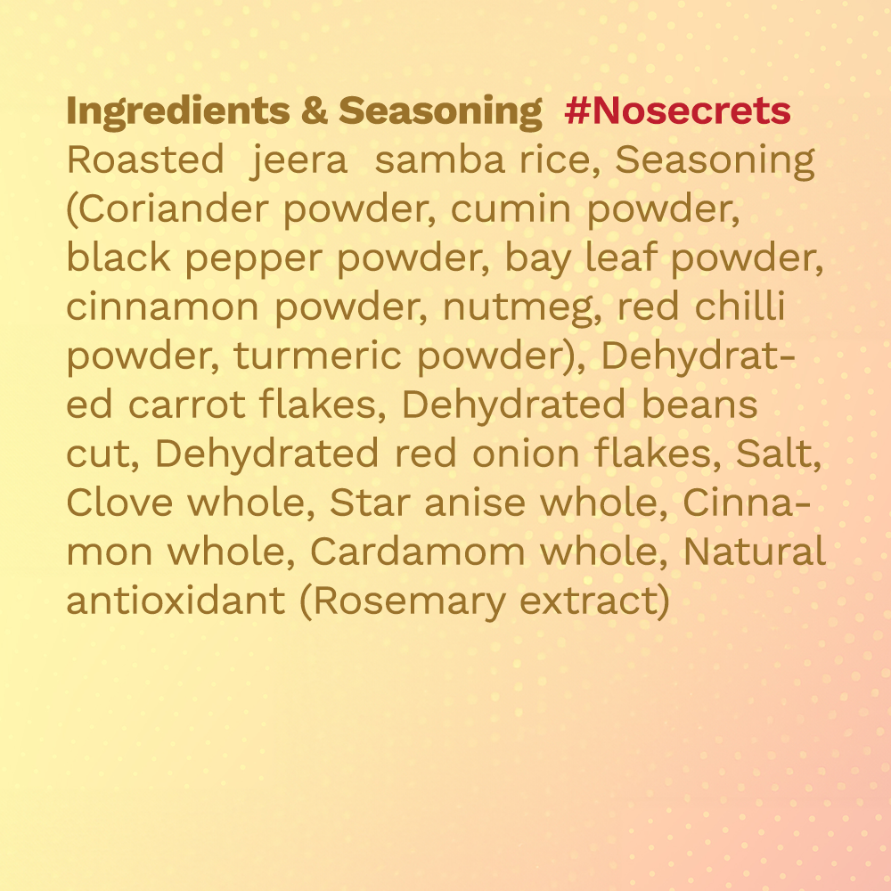 Roasted jeera samba rice, Seasoning (Coriander powder, cumin powder, black pepper powder, bay leaf powder, cinnamon powder, nutmeg, red chilli powder, turmeric powder), Dehydrated carrot flakes, Dehydrated beans cut, Dehydrated red onion flakes, Salt, Clove whole, Star anise whole, Cinnamon whole, Cardamom whole, Natural antioxidant (Rosemary extract).