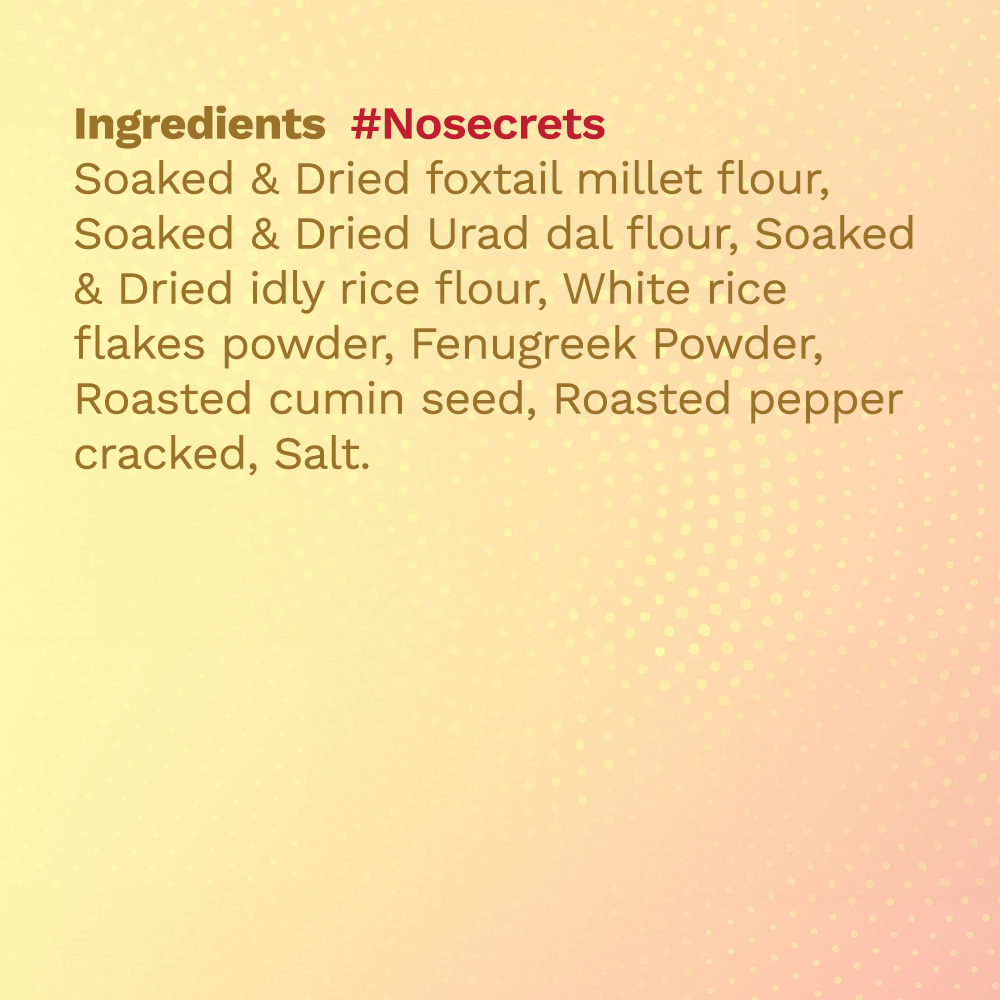 Soaked & Dried foxtail millet flour, Soaked & Dried Urad dal flour, Soaked & Dried idly rice flour, White rice flakes powder, Fenugreek Powder, Roasted cumin seed, Roasted pepper cracked, Salt.