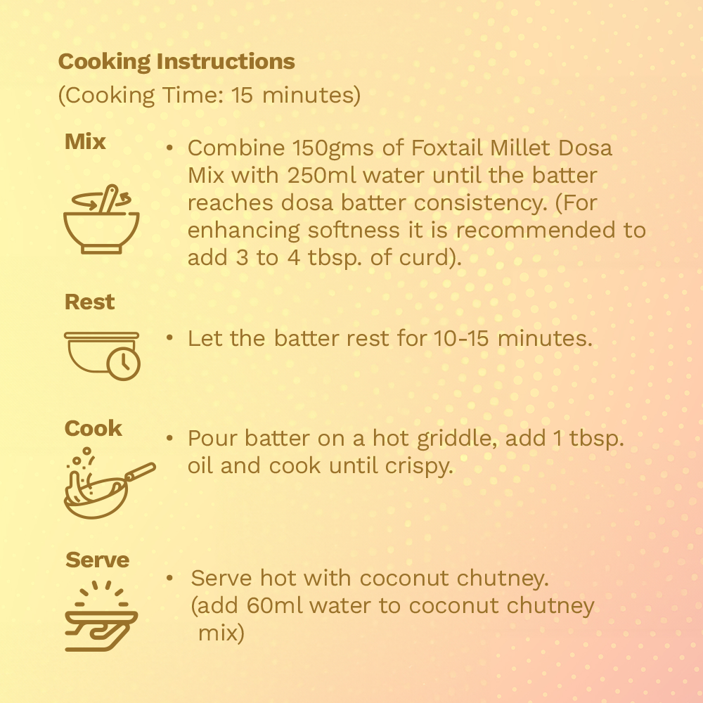 Combine 150gms of Foxtail Millet Dosa Mix with 250ml water until the batter reaches dosa batter consistency. (For enhancing softness it is recommended to add 3 to 4 tbsp. of curd).Let the batter rest for 10-15minutes.Pour batter on a hot griddle, add1 tbsp. oil and cook until crispy. Serve hot with coconut chutney.