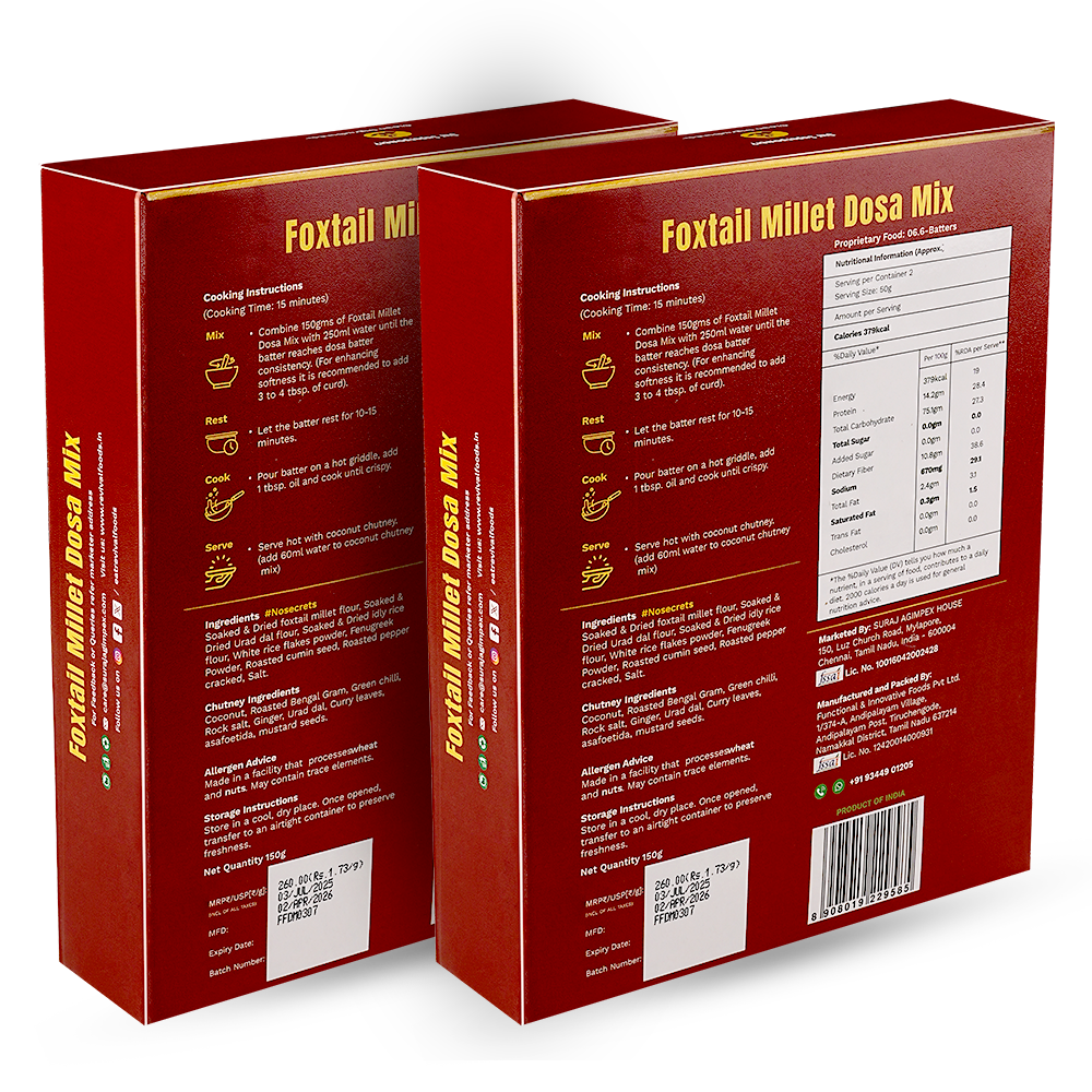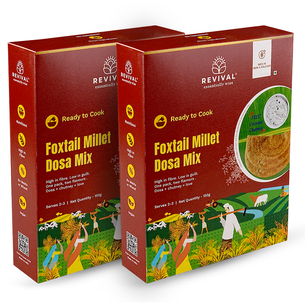 Combine 150gms of Foxtail Millet Dosa Mix with 250ml water until the batter reaches dosa batter consistency. (For enhancing softness it is recommended to add 3 to 4 tbsp. of curd).Let the batter rest for 10-15minutes.Pour batter on a hot griddle, add1 tbsp. oil and cook until crispy. Serve hot with coconut chutney.