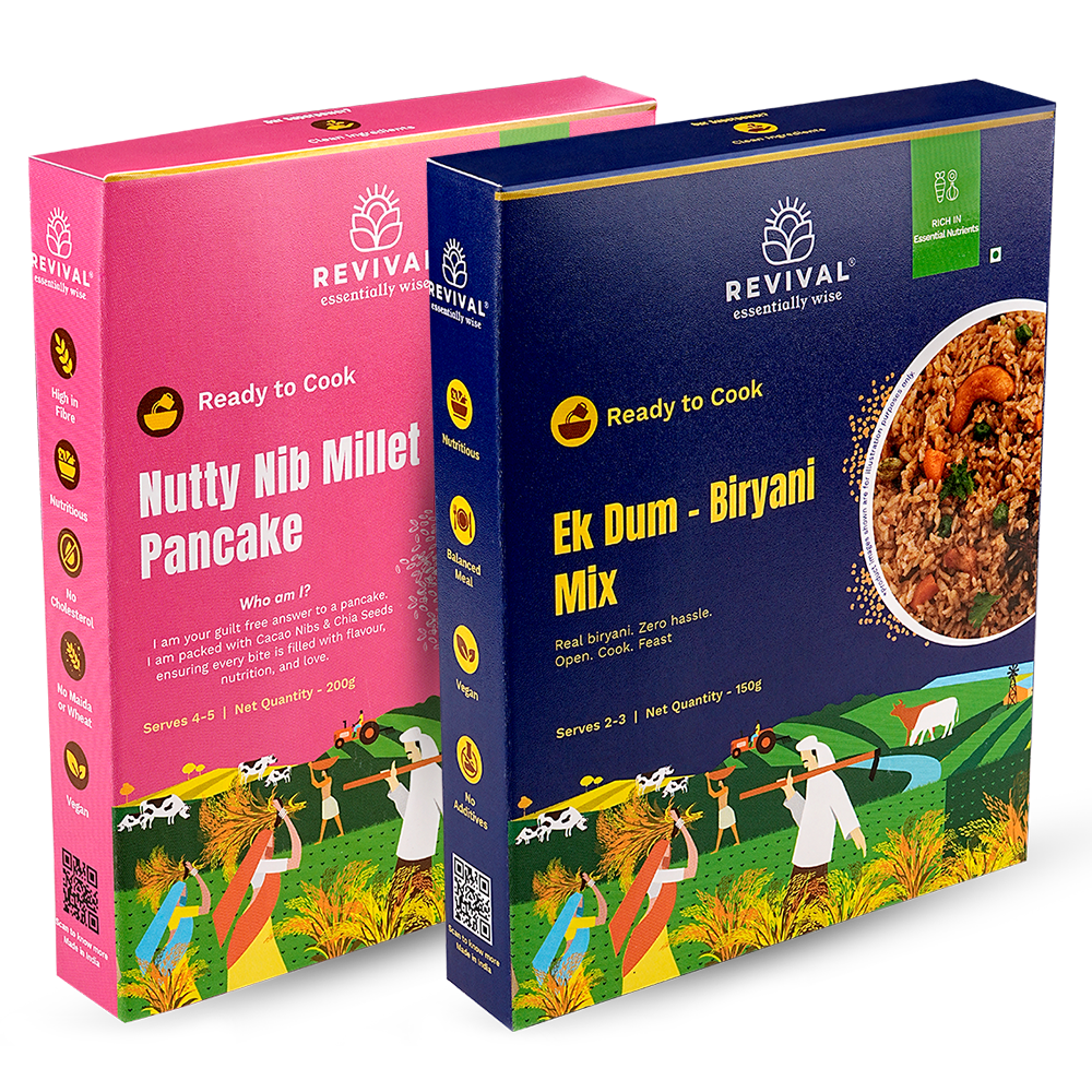 Revival Foods' Nutty Nib Millet Pancake Mix offers a nutritious twist on a classic favorite. Crafted with ancient grains like millet and enriched with crunchy cocoa nibs, this pancake mix brings together flavor, nutrition, and ease. Each bite is a delightful blend of nutty millet and rich cocoa, offering an indulgent taste experience that's both satisfying and guilt-free.