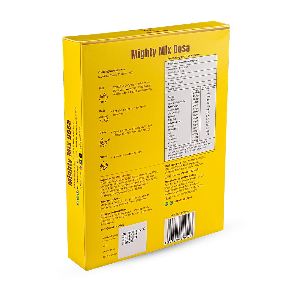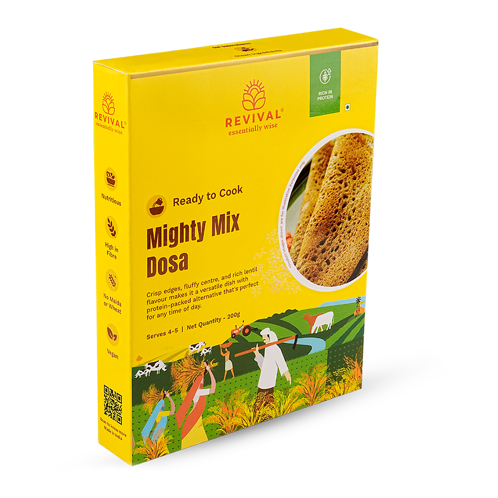 Revival Foods' Mighty Mix Dosa brings the authentic taste of South India to your plate with a unique blend of lentils and grains. This ready-to-cook mix combines the crispy edges and fluffy centre of traditional dosa with the wholesome, protein-rich goodness of lentils. Each serving is crafted to provide a nutritious, plant-based protein boost that fuels your day while supporting digestive health with fiber-rich ingredients.