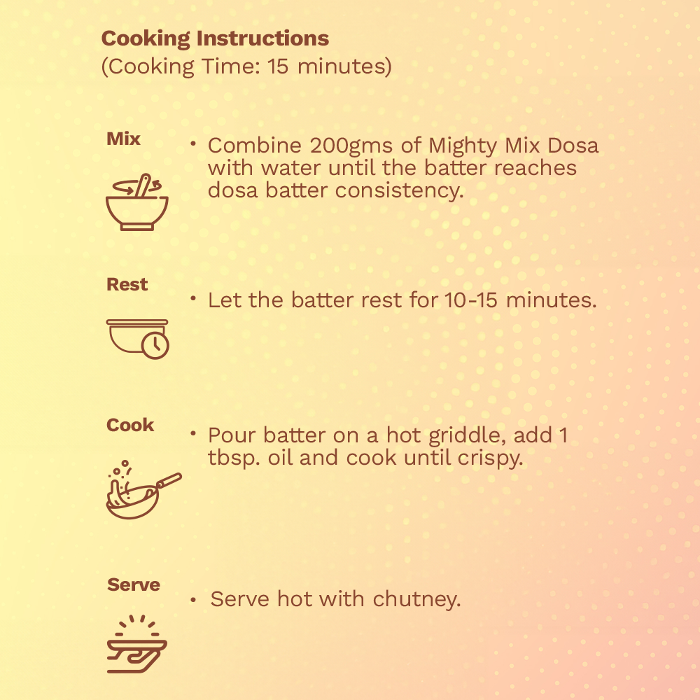 - Combine 200gms of Mighty Mix Dosa with water until the batter reaches dosa batter consistency.Let the batter rest for 10-15 minutes.
