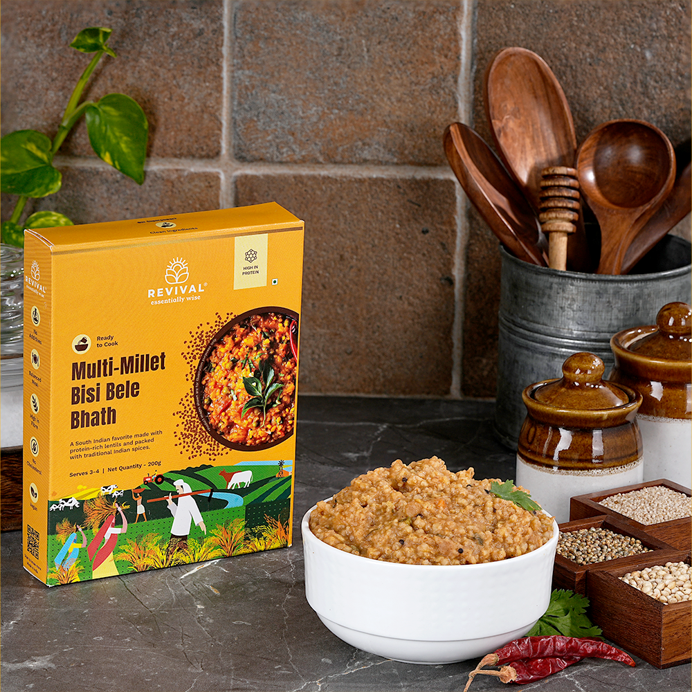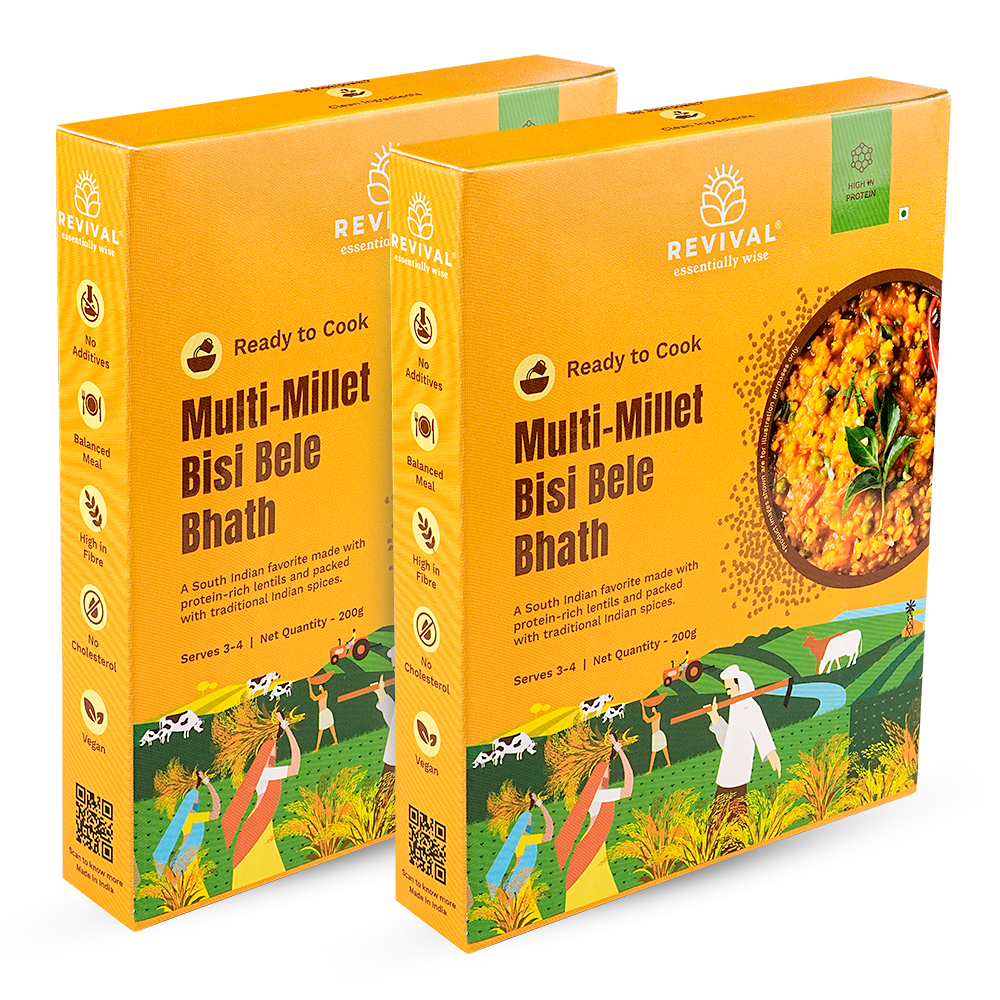 The Multi-Millet Bisi Bele Bhath from Revival Foods is a delicious, ready-to-cook version of the traditional South Indian rice dish, made healthier with the addition of multiple millets. This meal is packed with protein-rich lentils, traditional Indian spices, and a blend of nutritious millets, offering a balanced and flavourful dish. Perfect for lunch or dinner, this Bisi Bele Bhath is vegan, gluten-free, and easy to prepare, making it an excellent choice for health-conscious individuals who don’t want to compromise on taste.