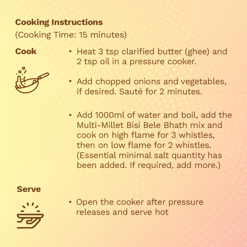 - Mix the Multi Millet Bisi Bele Bath mix with 3 teaspoons of ghee and 2 teaspoons of cooking oil in a pressure cooker, Sauté for 2 minutes Add onion and vegetables, if required (Essential minimal salt quantity has been added. If required, add more.)