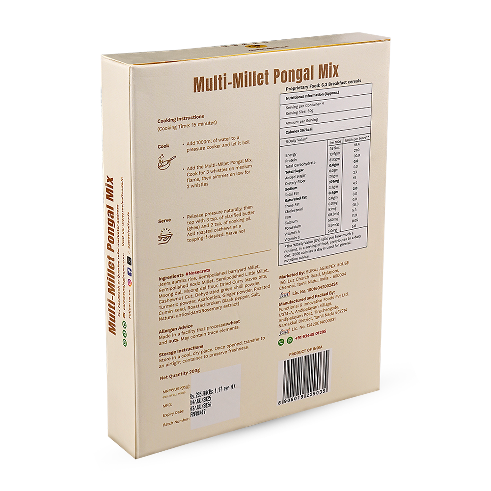 Multi-Millet Pongal Mix | 200 g (Serves 3–4) | Authentic South Indian Recipe | High in Fiber | Low Glycaemic Index & Diabetic-Friendly .