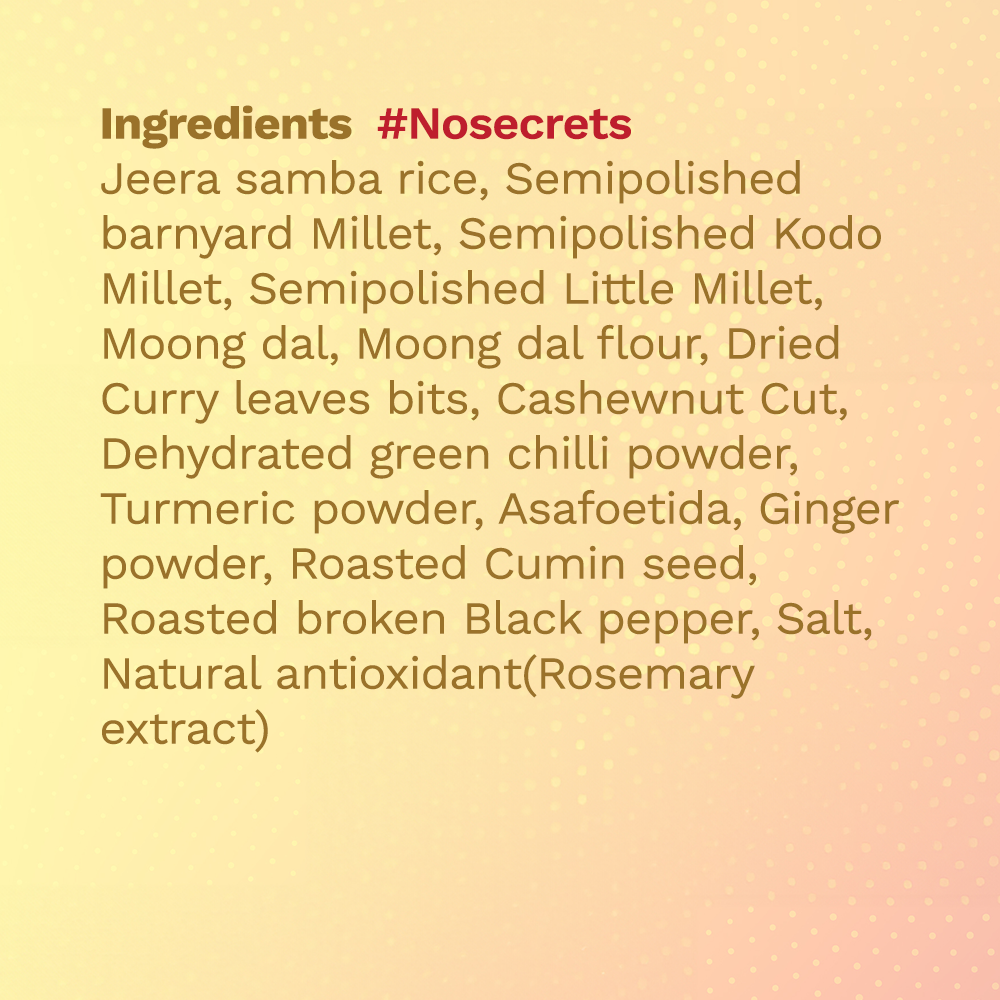 Rice (Jeera Sarnba Rice), Millets(Barnyard, Kodo & Little), Moong dal, Seasoning Mix, Cashew nut Curry leaves, salt and Natural antioxidant (Rosemary extract )