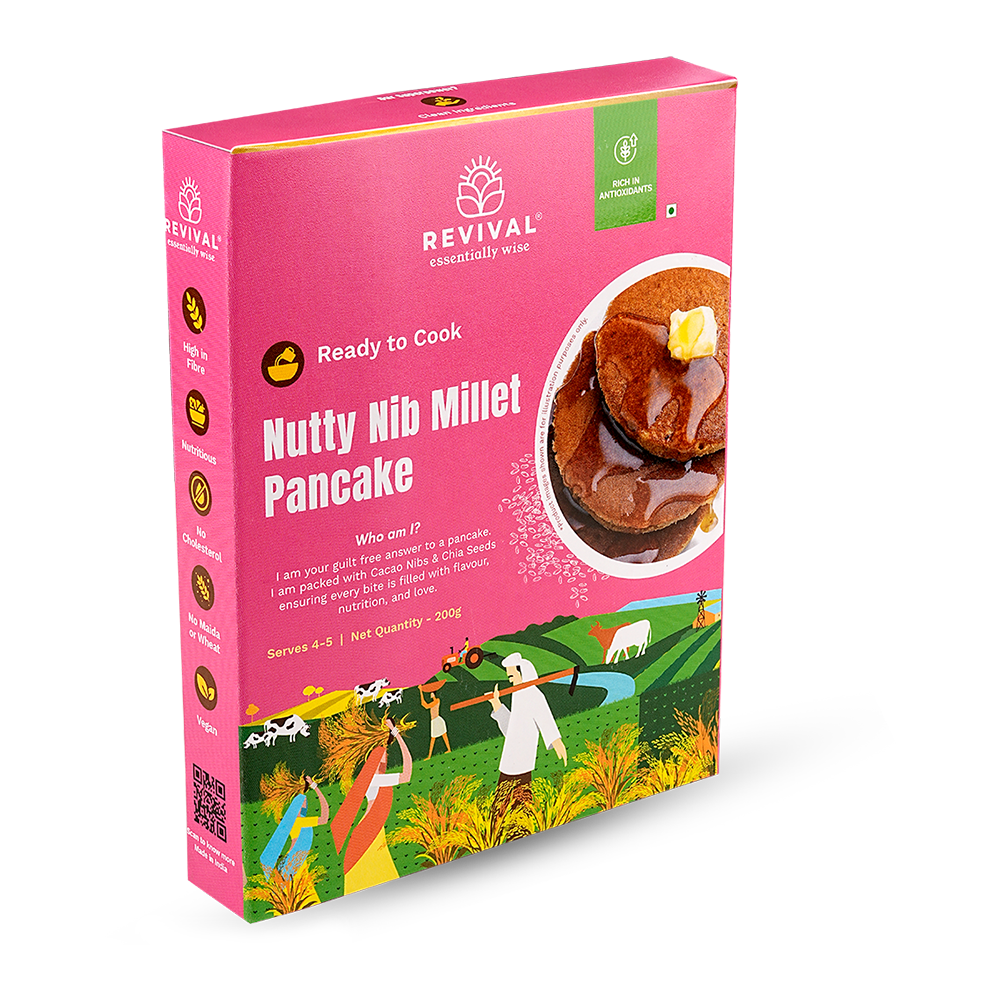 Revival Foods' Nutty Nib Millet Pancake Mix offers a nutritious twist on a classic favorite. Crafted with ancient grains like millet and enriched with crunchy cocoa nibs, this pancake mix brings together flavor, nutrition, and ease. Each bite is a delightful blend of nutty millet and rich cocoa, offering an indulgent taste experience that's both satisfying and guilt-free.