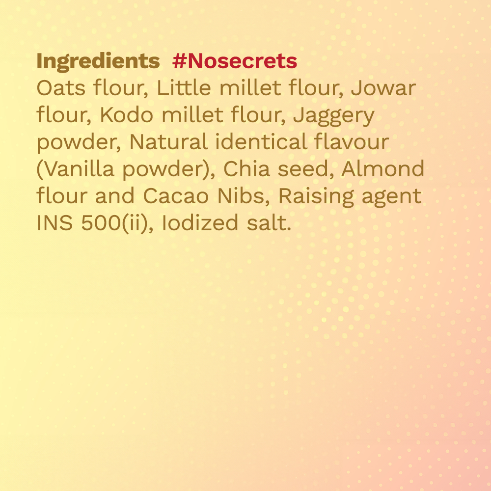 Oats flour,little millet flour,Jowar flour,Kodo millet flour,jaggery powder,Baking powder,Raising agent 500 (ii),iodized salt,natural identical flavour(Vanilla),chia seed,Almond flour and Cacao Nibs